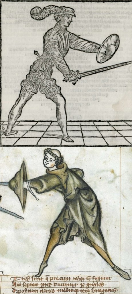 Les sources primaires de combat à l’épée et au bouclier sont rares et somme toute limitées à l’usage du bocle, un petit bouclier rond qui fût utilisé pendant des siècles, et qui était encore présent sur les champs de bataille de la renaissance.